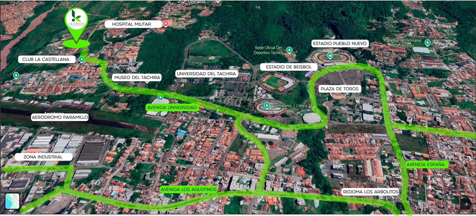 IKONOS está ubicado en el sector La Castellana, antigua zona cafetalera de San Cristóbal, en el estado Táchira, una zona de clima de montaña característica del norte de la ciudad.